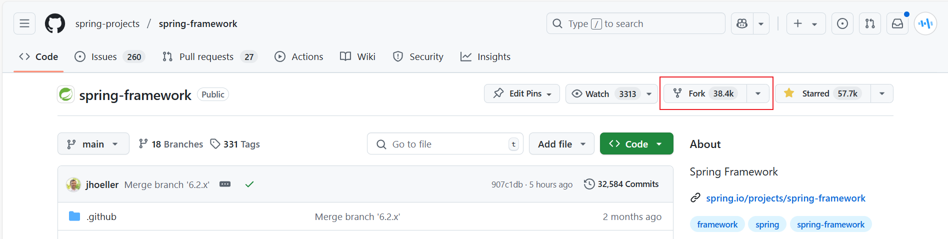 注册Github账号,打开Spring Framework代码仓库,点击Fork,将项目源码Fork到自己的仓库中。