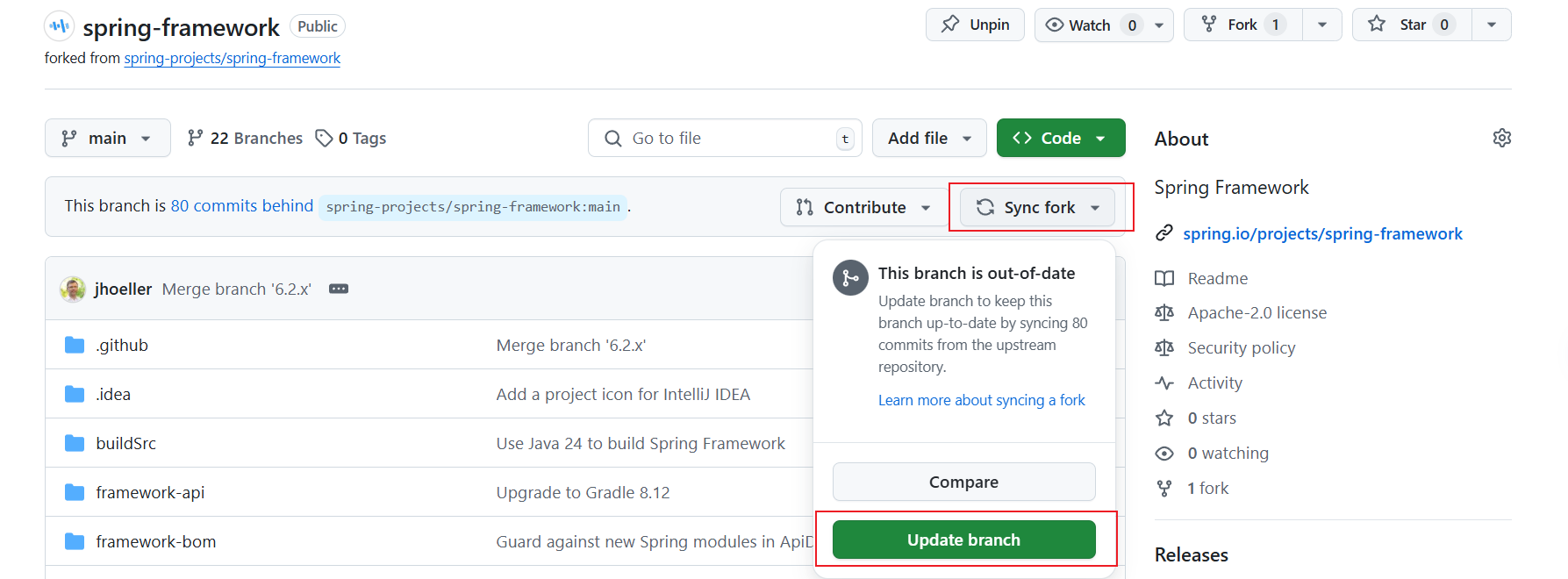 在Github上点击Sync fork,将自己仓库的main分支同Spring仓库的main分支保持一致。