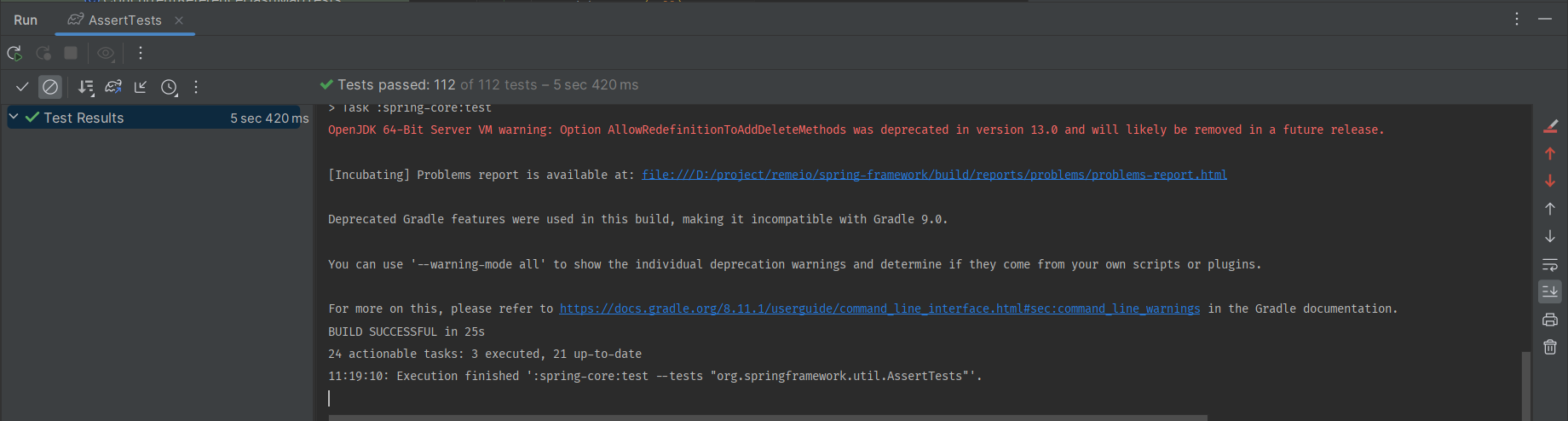 选择一个单元测试(如org.springframework.util.AssertTests),进行运行,以验证项目构建成功。